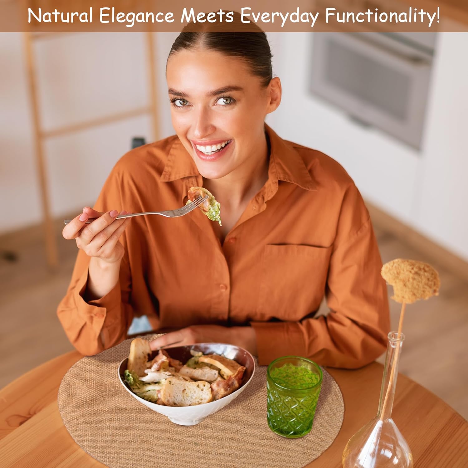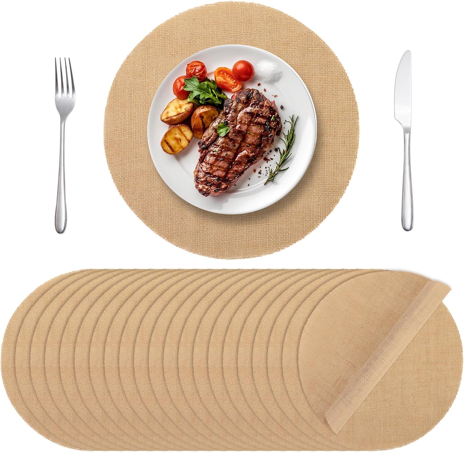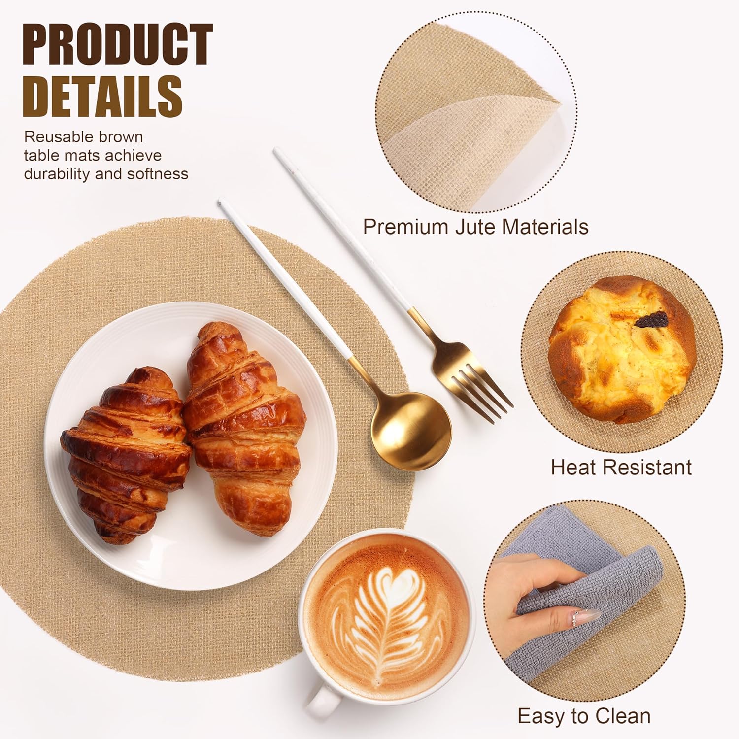 Aneco 50 Pieces Round Burlap Placemats 11.8 Inch Reusable Brown Table Mats Heat Resistant Natural Jute Fibers Placemats Burlap Circle Rustic Table Decorations for Dinner Holiday Farmhouse Decor