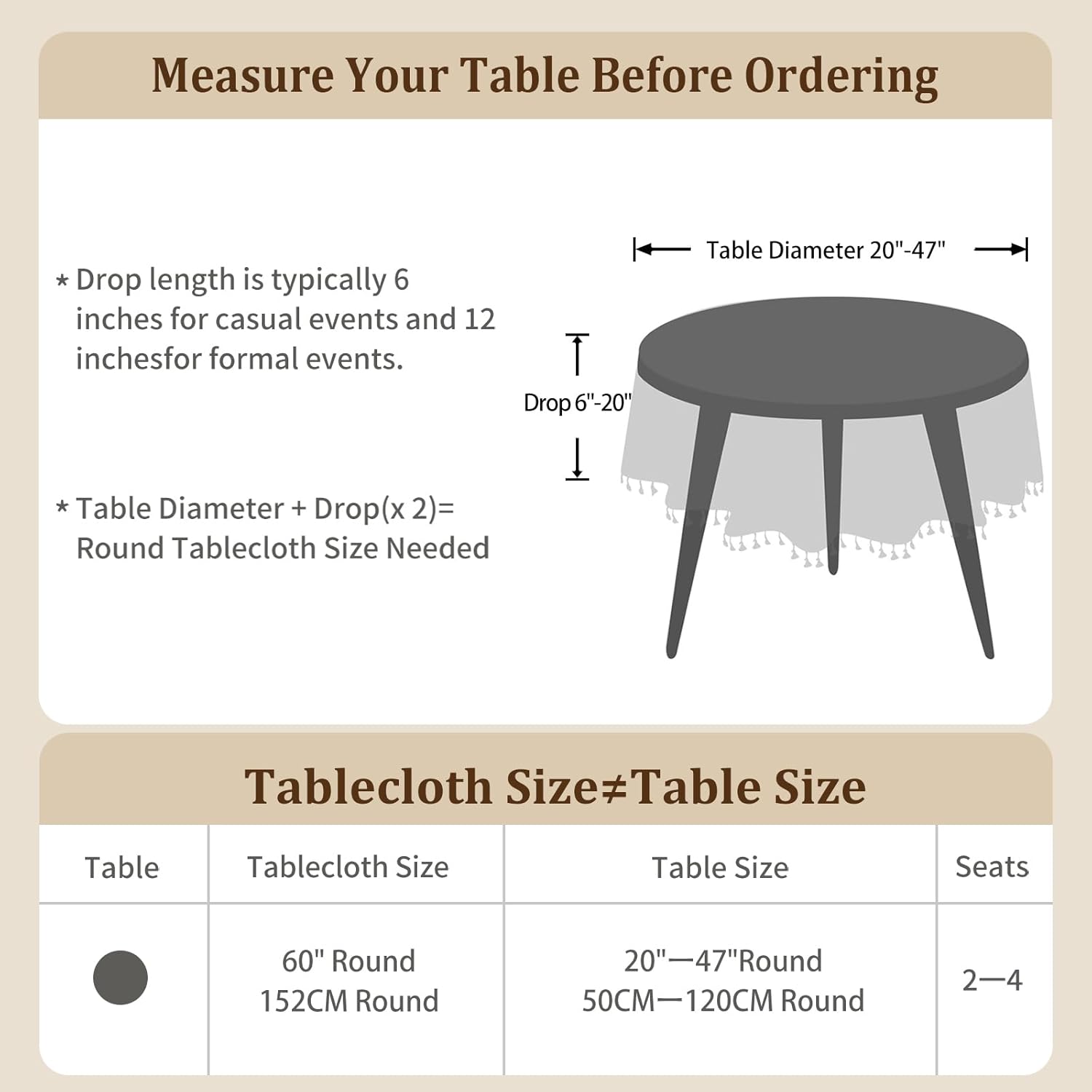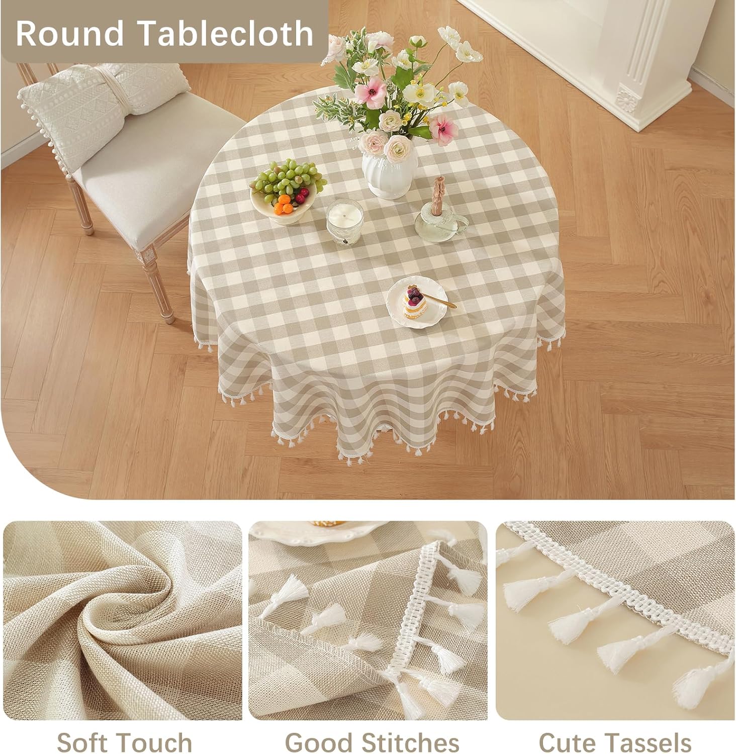 Laolitou Beige Checkered Round Tablecloth Washable Buffalo Plaid Table Cloth with Tassel Cotton Linen Gingham Table Cover for Dining Room, Beige, Round, 60", 2-4 Seats